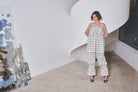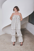 Wide straight pants with drawstring detail and checkered detail done with hand fagotting.