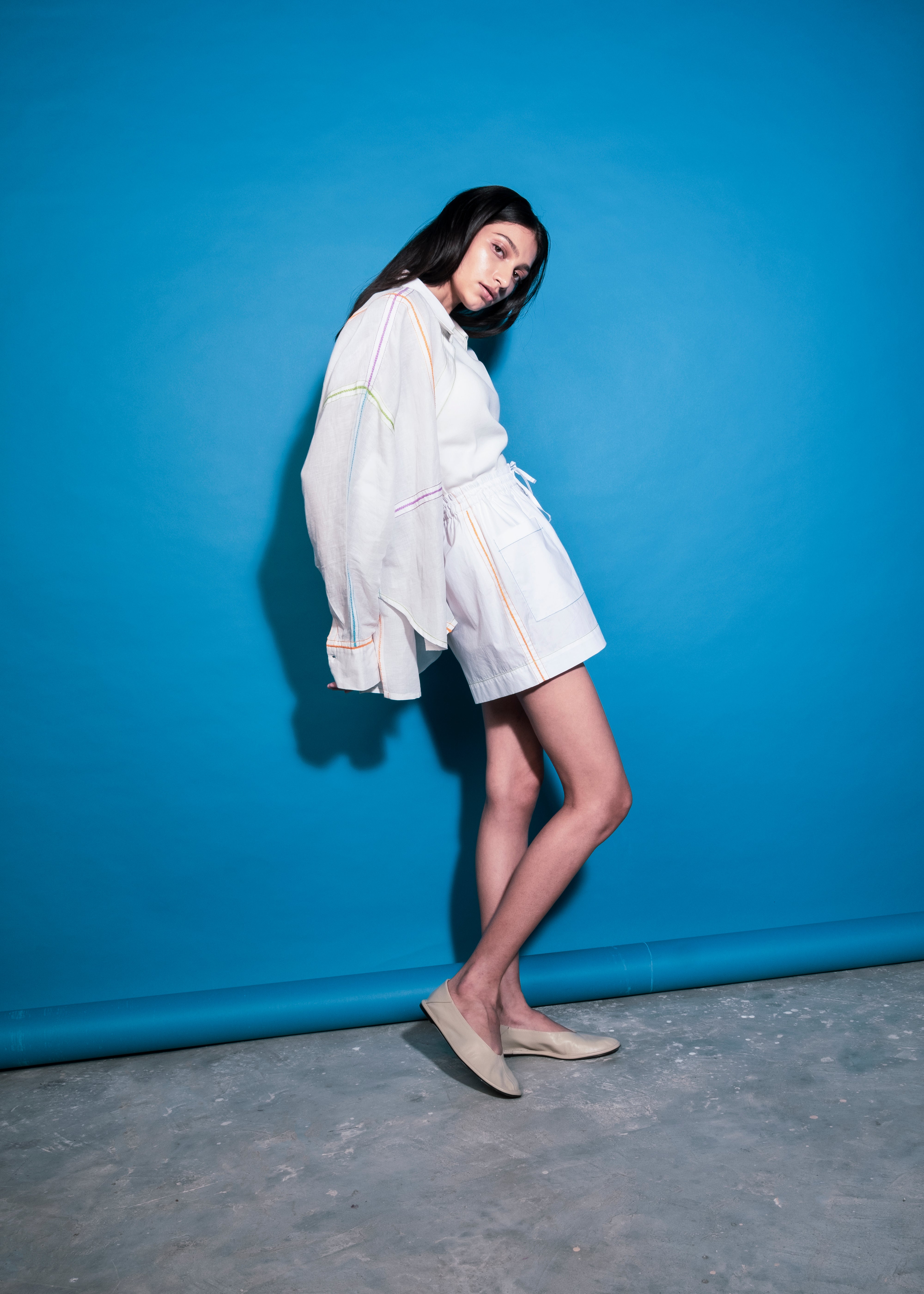 - Roomy shorts with elastic belt and draw string at the waist. Multicolour hand fagotting detail along the sides. Perfect for a summer day.